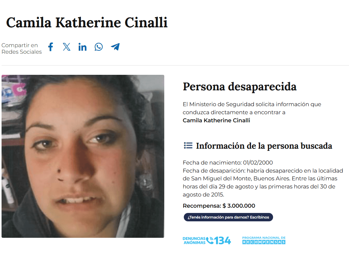 El 29 de agosto, de no dar con su paradero, se cumplirán 11 años de la desaparición de Camila. Continúa siendo buscada por las fuerzas públicas y el caso mantiene en vilo a San Miguel del Monte.