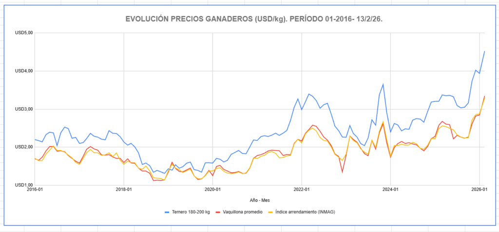 Foto 4: evolución de precios ganaderos (USD/kg) para ternero 180-200 kgs, vaquillona promedio e índice INMAG. Período 2016-2026. Fuente: elaboración propia en base a datos de Agroseries CREA, Entresurcos y corrales y MAG.