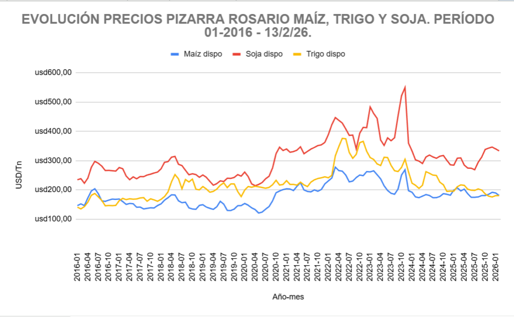 Foto 3: evolución de precios Pizarra Rosario (USD/Tn) para maíz, soja y trigo. Período 2016-2026. Fuente: elaboración propia en base a datos de Agroseries CREA.