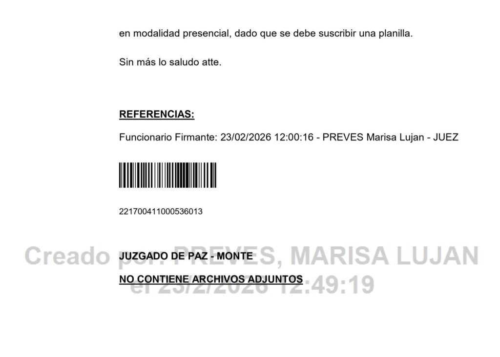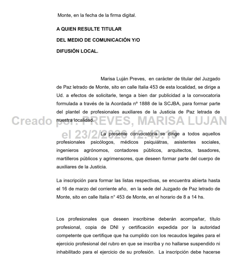 Convocatoria: Juzgado de Paz Letrado Monte – Dra. Marisa Luján Preves